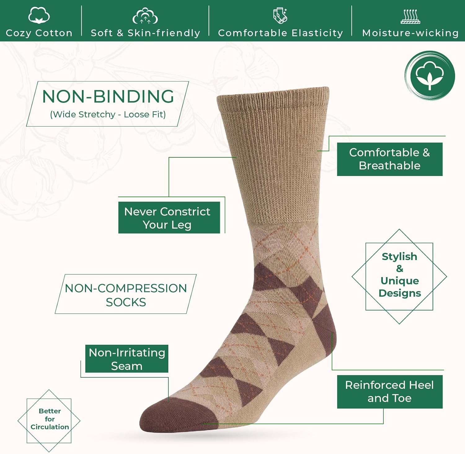 - DIABETIC SOLID Socks: Do you want to feel comfortable and also wear GOOD LOOKING diabetic Non-Binding socks for men Extra Wide. Our unique Seamless Cotton Socks let you stay healthy but without loosing your style!