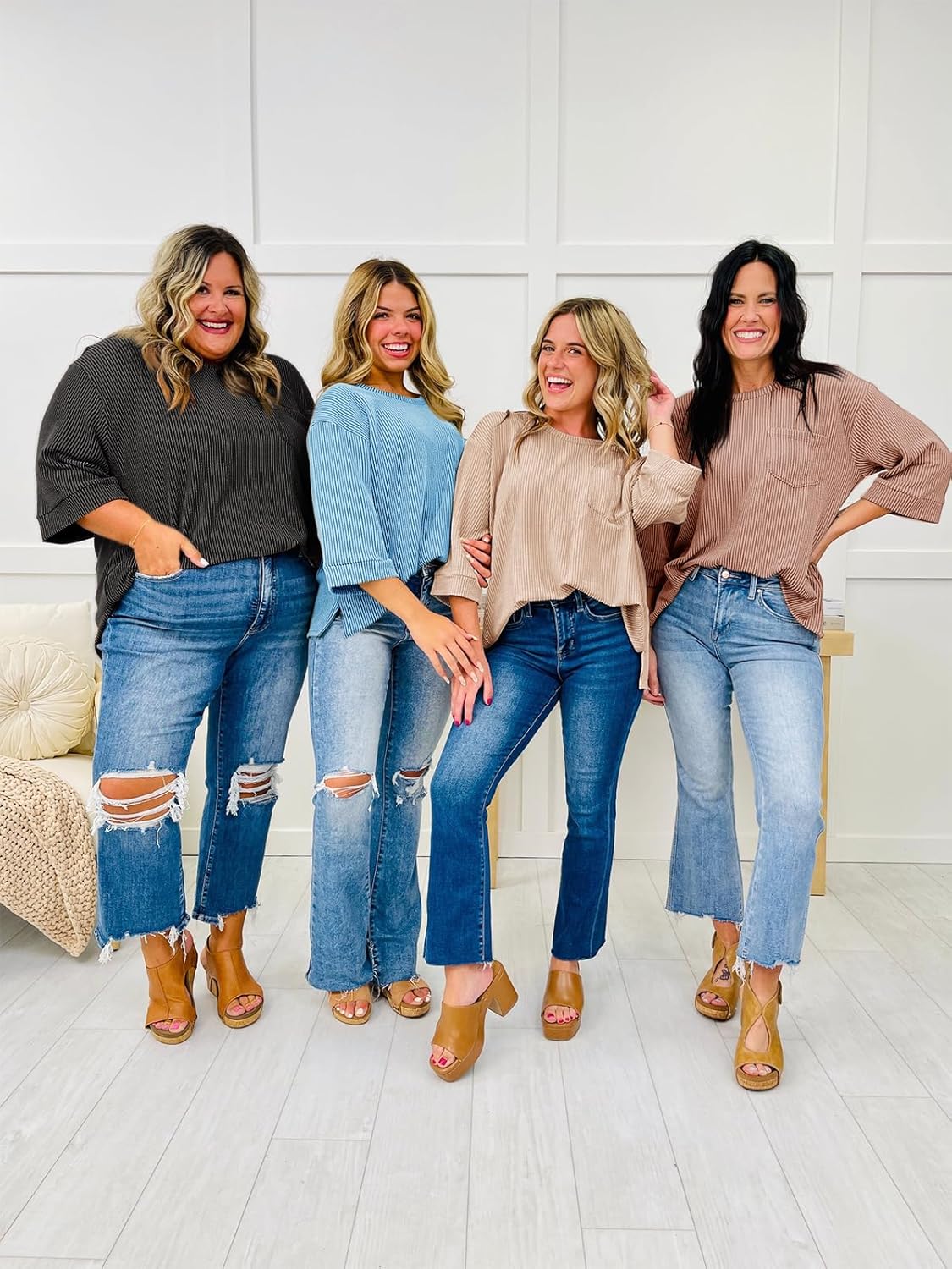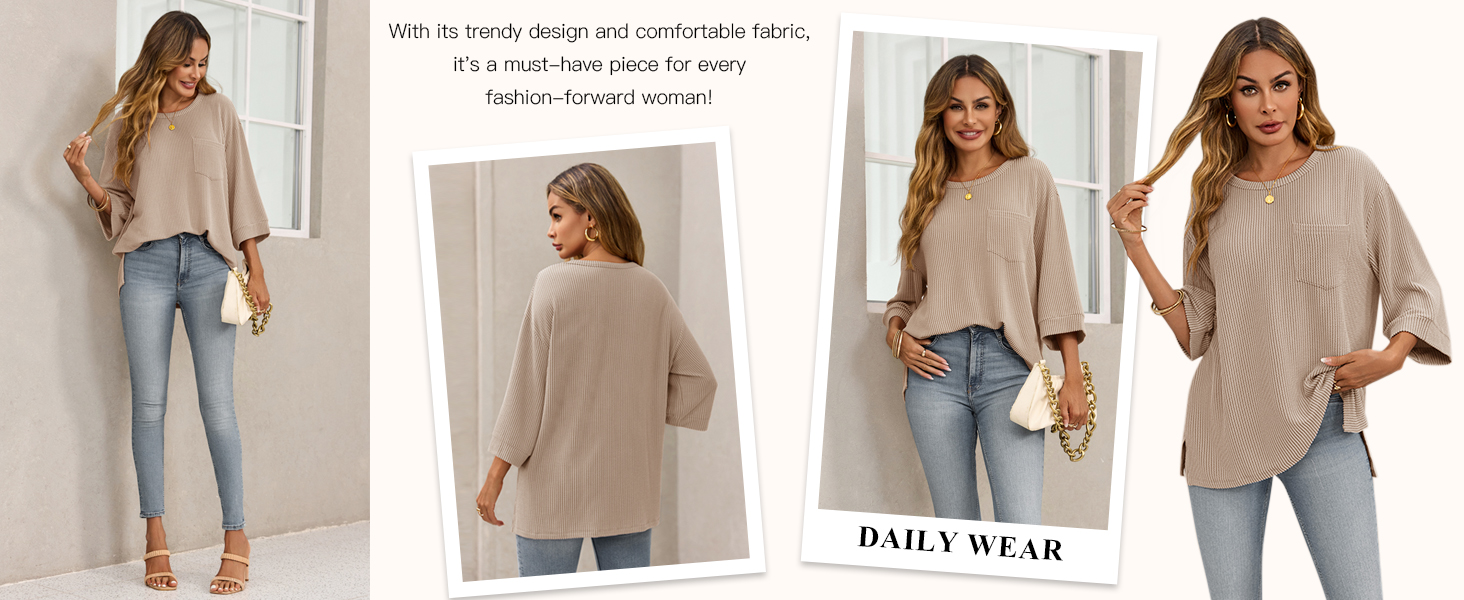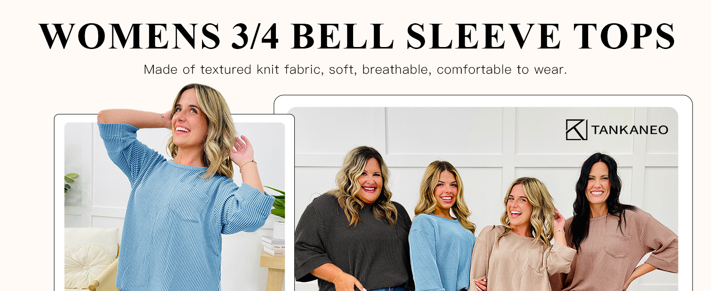 Tankaneo Womens Oversized 3/4 Bell Sleeve Tops Summer Casual Textured Knit T Shirts Loose Fit Crewneck Blouse Tees